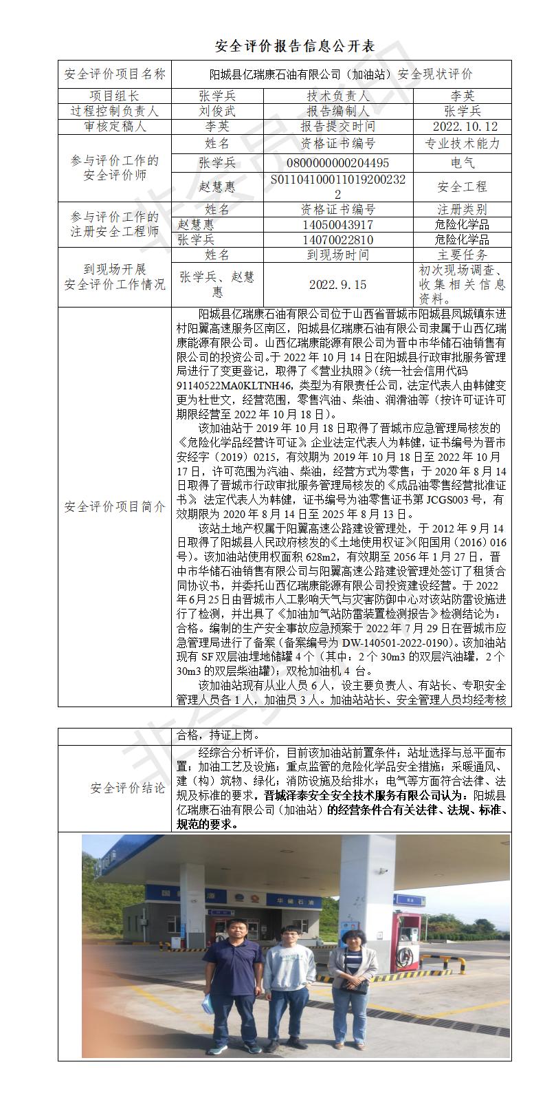 陽城縣億瑞康石油有限公司(加油站)安全現(xiàn)狀評價