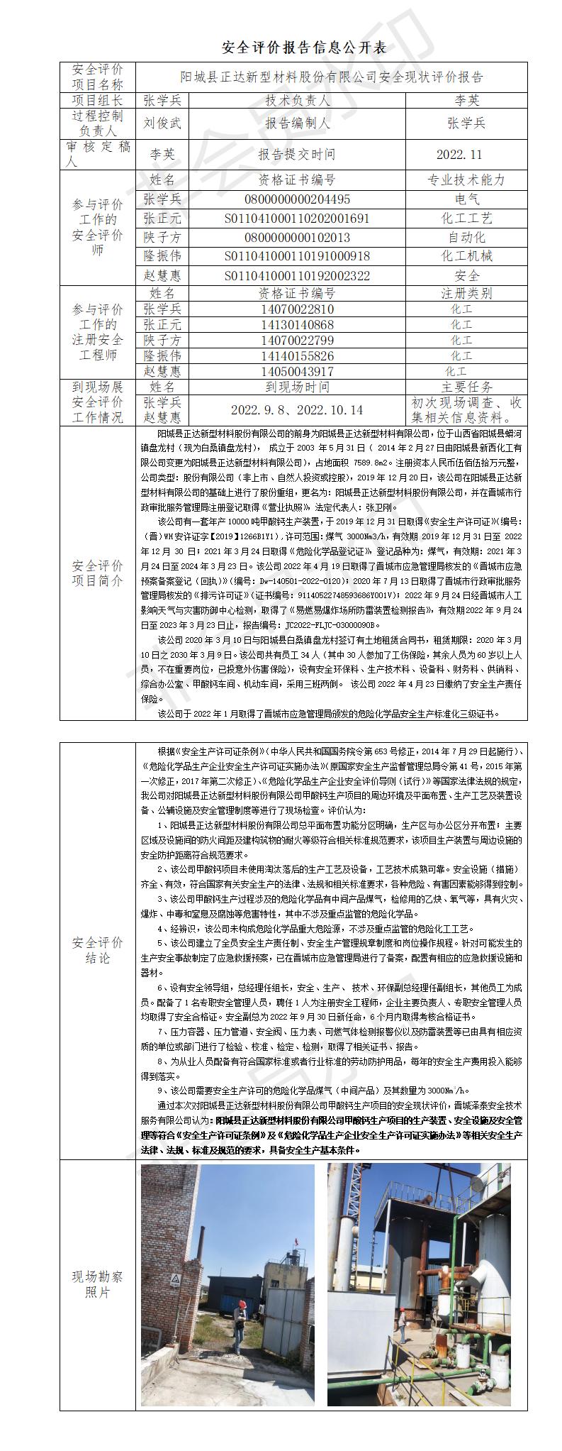 陽城縣正達新型材料股份有限公司安全現(xiàn)狀評價報告