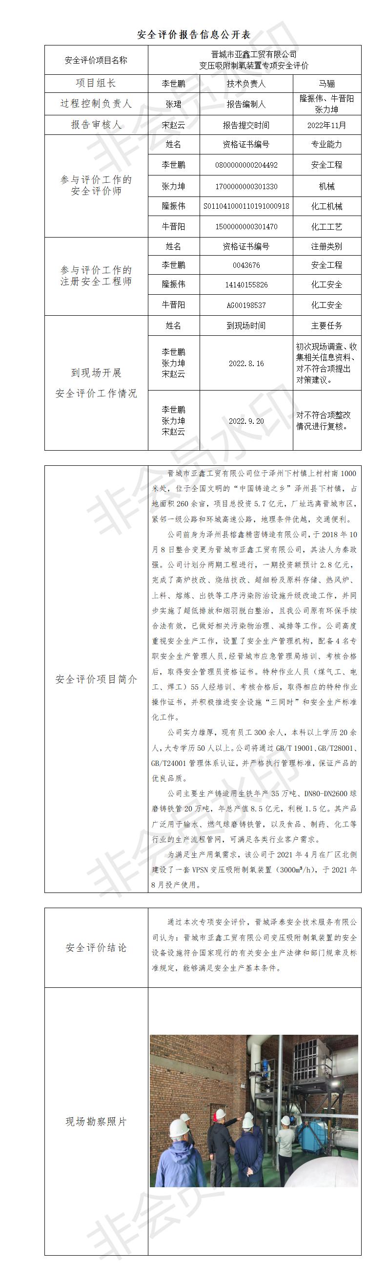 晉城市亞鑫工貿(mào)有限公司變壓吸附制氧裝置專項安全評價