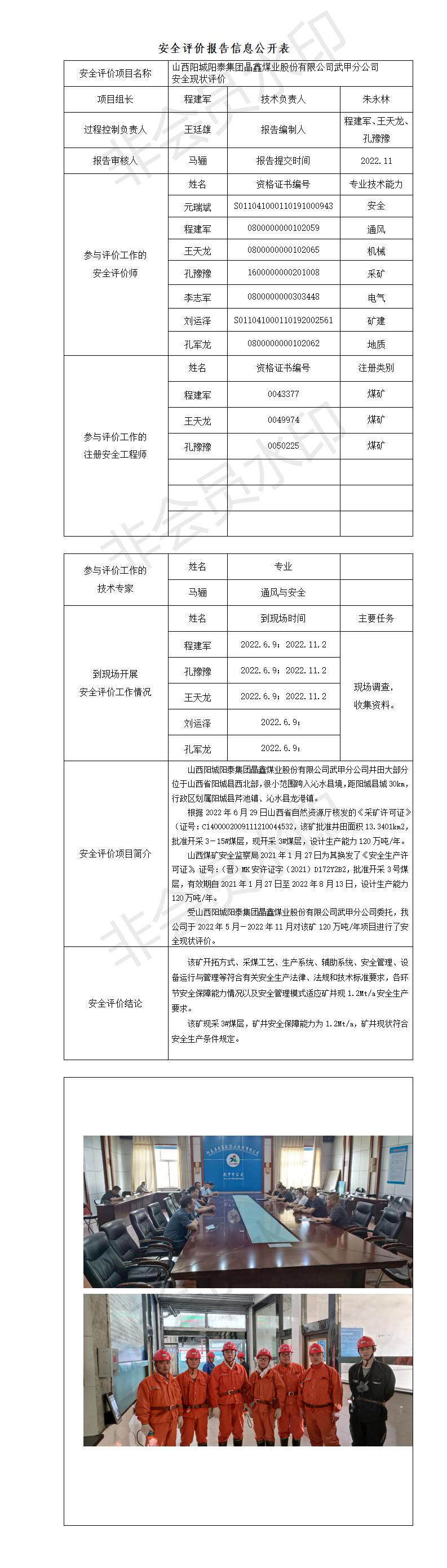 山西陽(yáng)城陽(yáng)泰集團(tuán)晶鑫煤業(yè)股份有限公司武甲分公司安全現(xiàn)狀評(píng)價(jià)