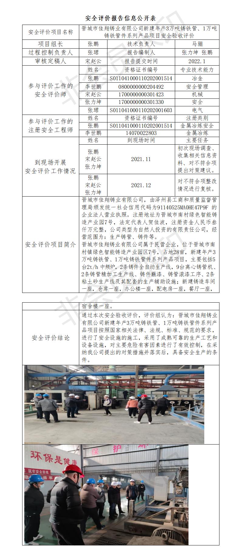 晉城市佳翔鑄業(yè)有限公司新建年產(chǎn)3萬噸鑄鐵管、1萬噸 鑄鐵管件系列產(chǎn)品項目安全驗收評價