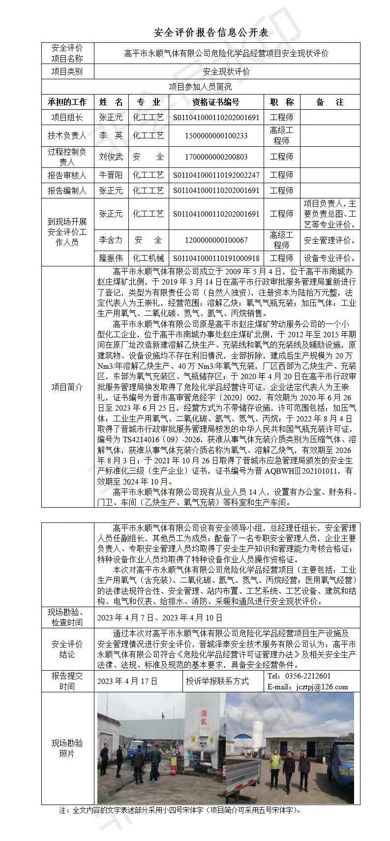 高平市永順氣體有限公司危險化學(xué)品經(jīng)營項目安全現(xiàn)狀評價