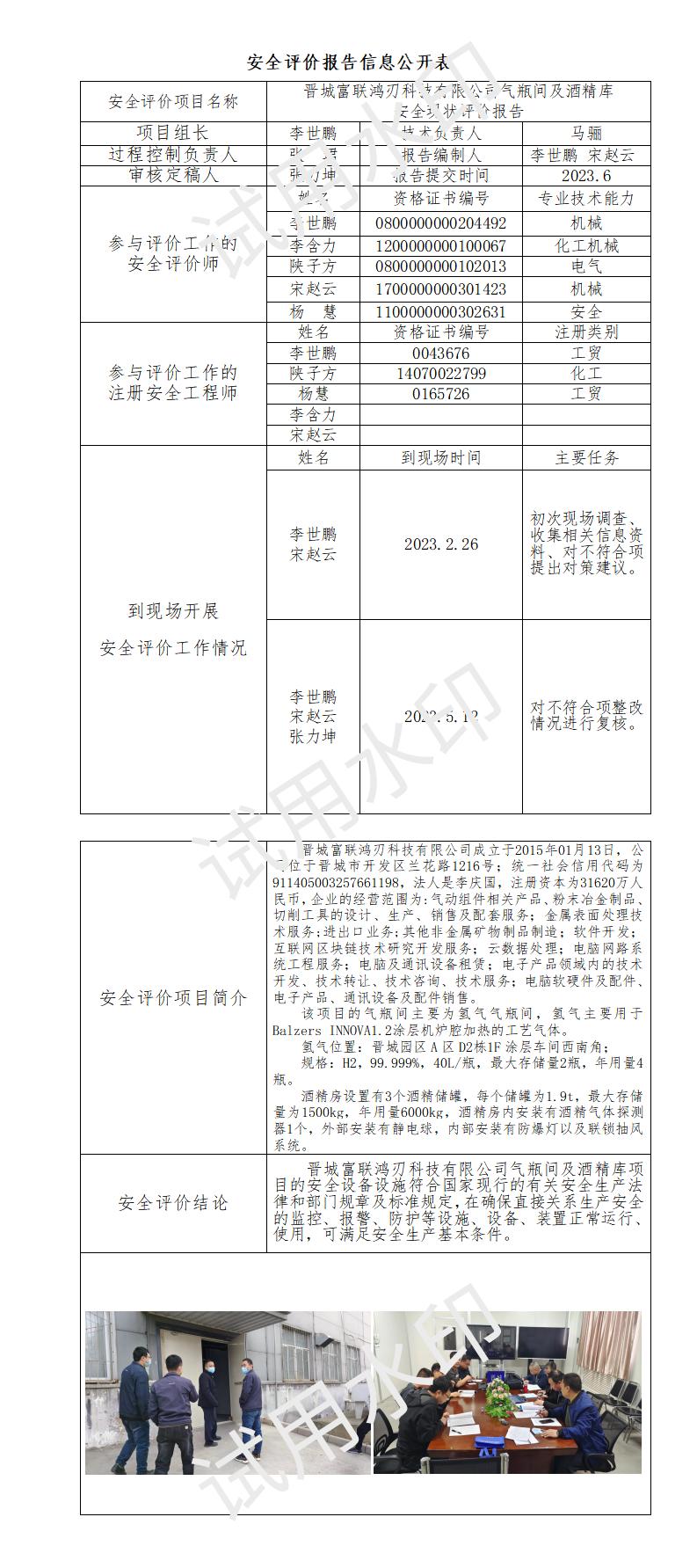 晉城富聯(lián)鴻刃科技有限公司氣瓶間及酒精庫安全現(xiàn)狀報告