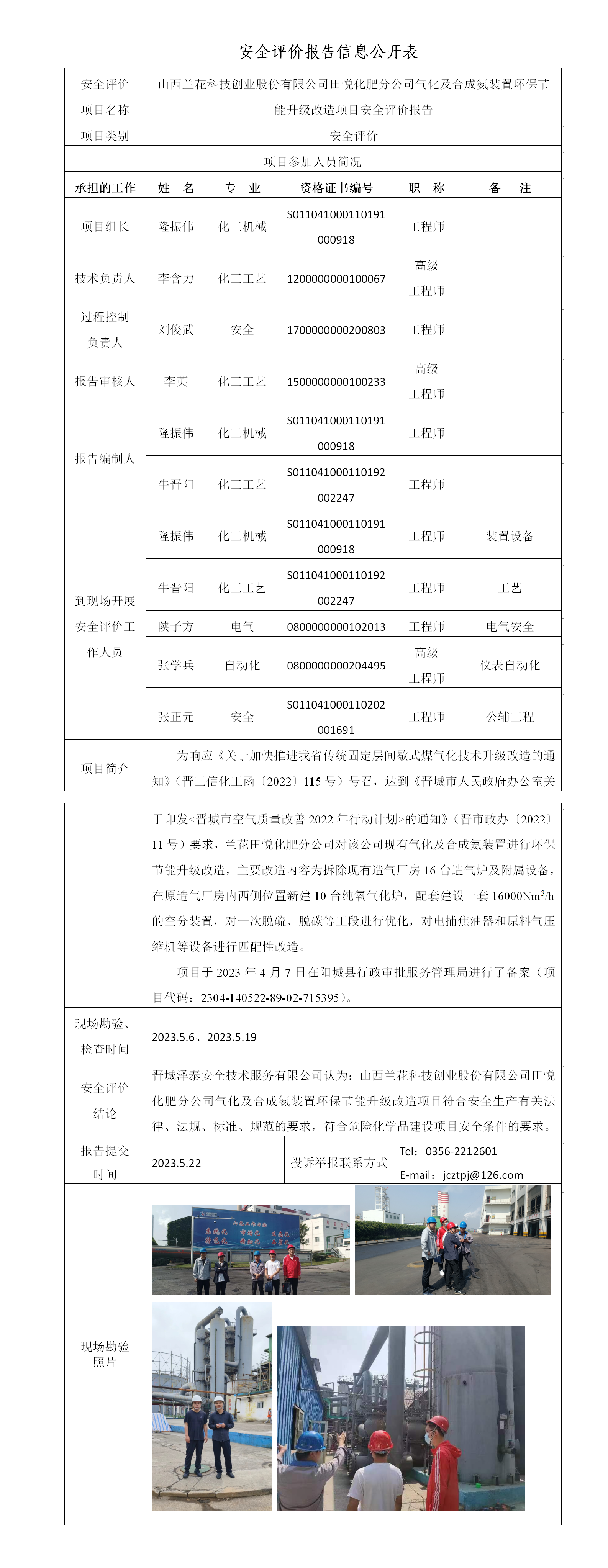 山西蘭花科技股份有限公司田悅化肥分公司氣化及合成氨裝置環(huán)保節(jié)能升級改造項目安全評價報告