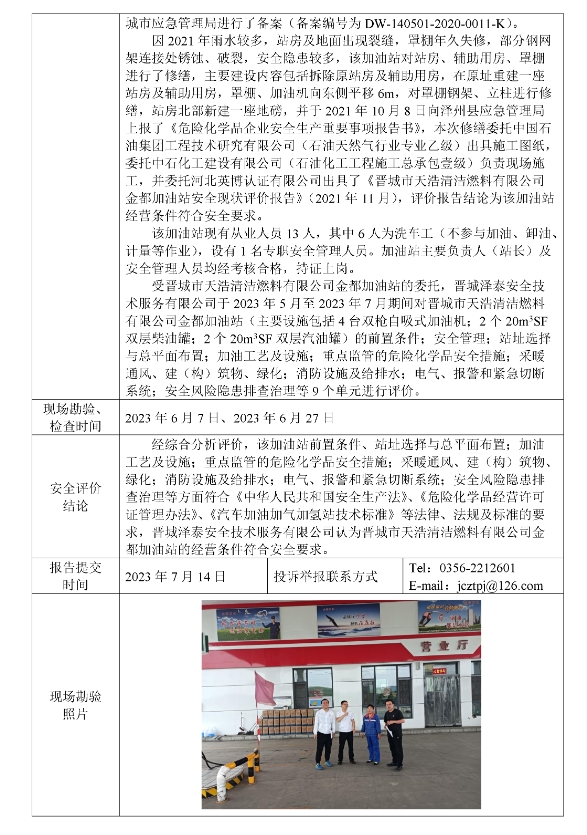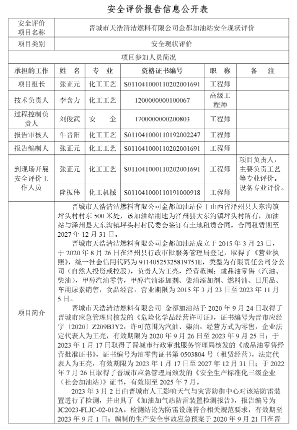 晉城市天浩清潔燃料有限公司金都加油站安全現(xiàn)狀評(píng)價(jià)