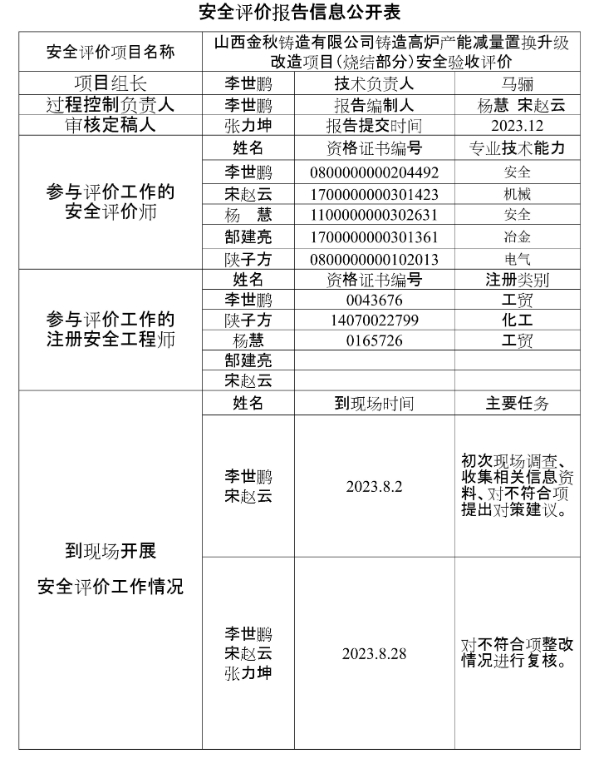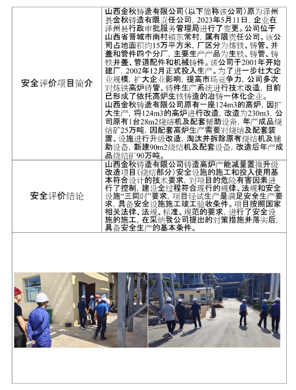 山西金秋鑄造有限公司鑄造高爐產(chǎn)能減量置換升級改造項目(燒結部分)安全驗收評價