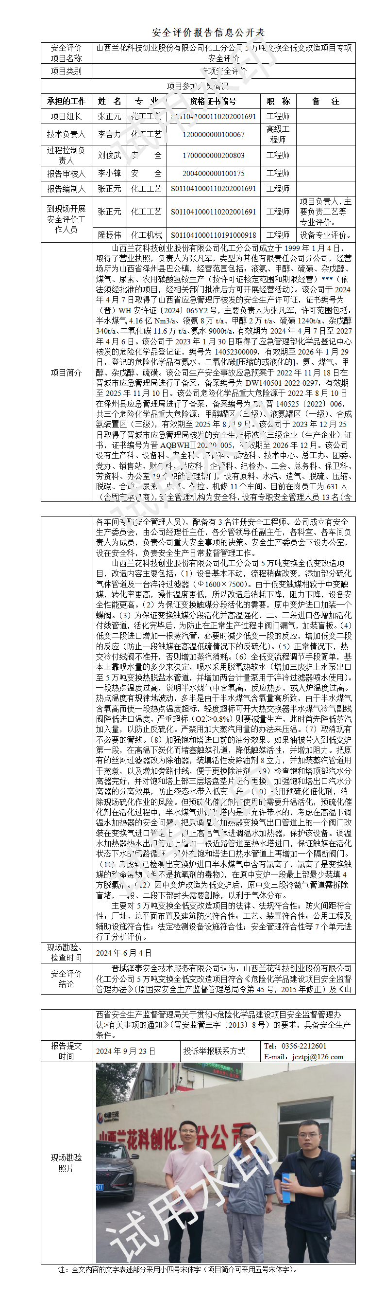 山西蘭花科技創(chuàng)業(yè)股份有限公司化工分公司5萬(wàn)噸變換全低變改造項(xiàng)目專項(xiàng)安全評(píng)價(jià)
