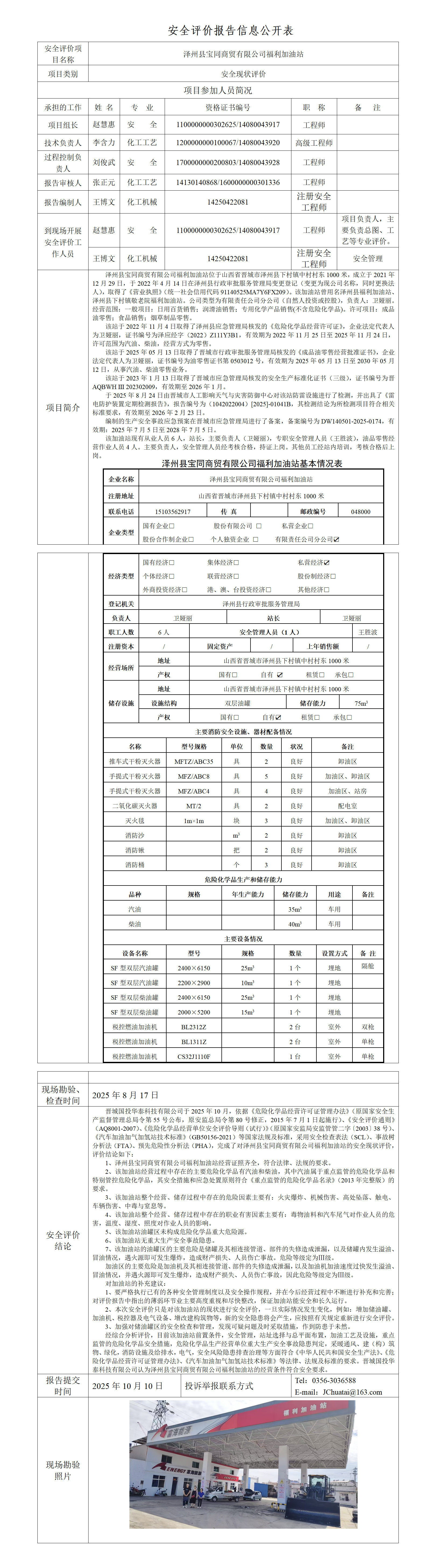 澤州縣寶同商貿(mào)有限公司福利加油站安全現(xiàn)狀評(píng)價(jià)