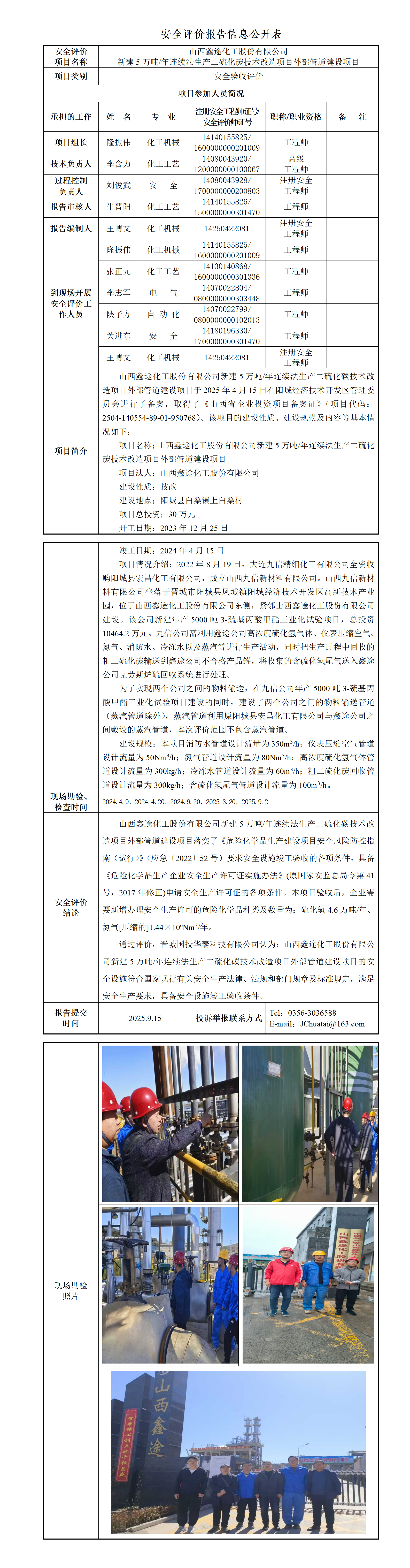 山西鑫途化工股份有限公司新建5萬噸/年連續(xù)法生產(chǎn)二硫化碳技術(shù)改造項(xiàng)目外部管道建設(shè)項(xiàng)目安全驗(yàn)收評價(jià)