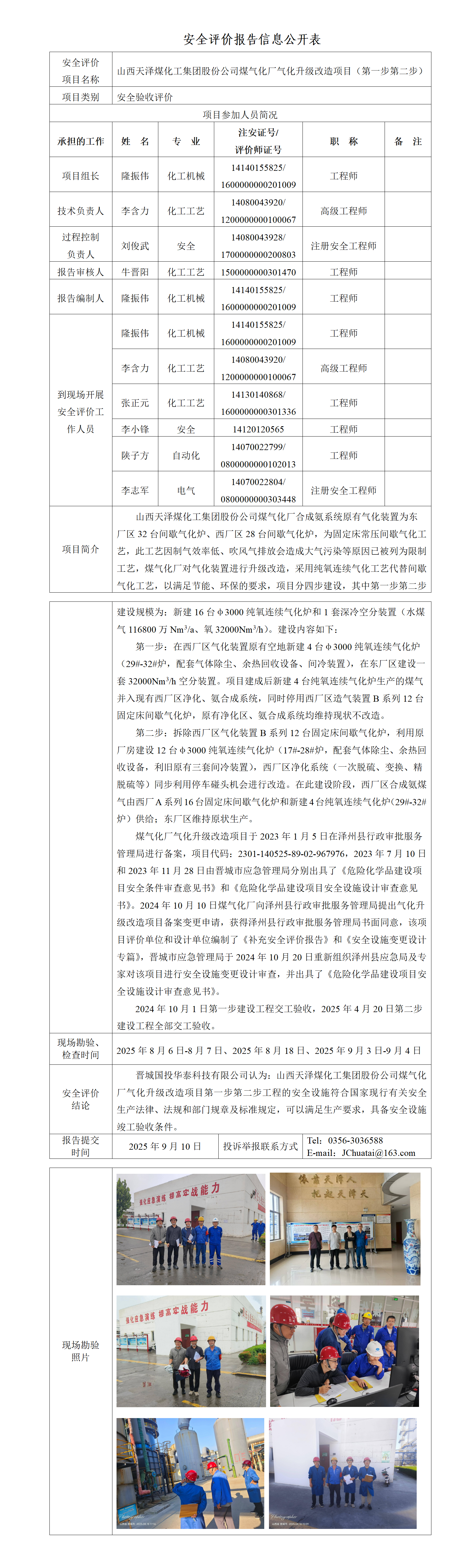 山西天澤煤化工集團(tuán)股份公司煤氣化廠氣化升級(jí)改造項(xiàng)目(第一步第二步)安全驗(yàn)收評(píng)價(jià)