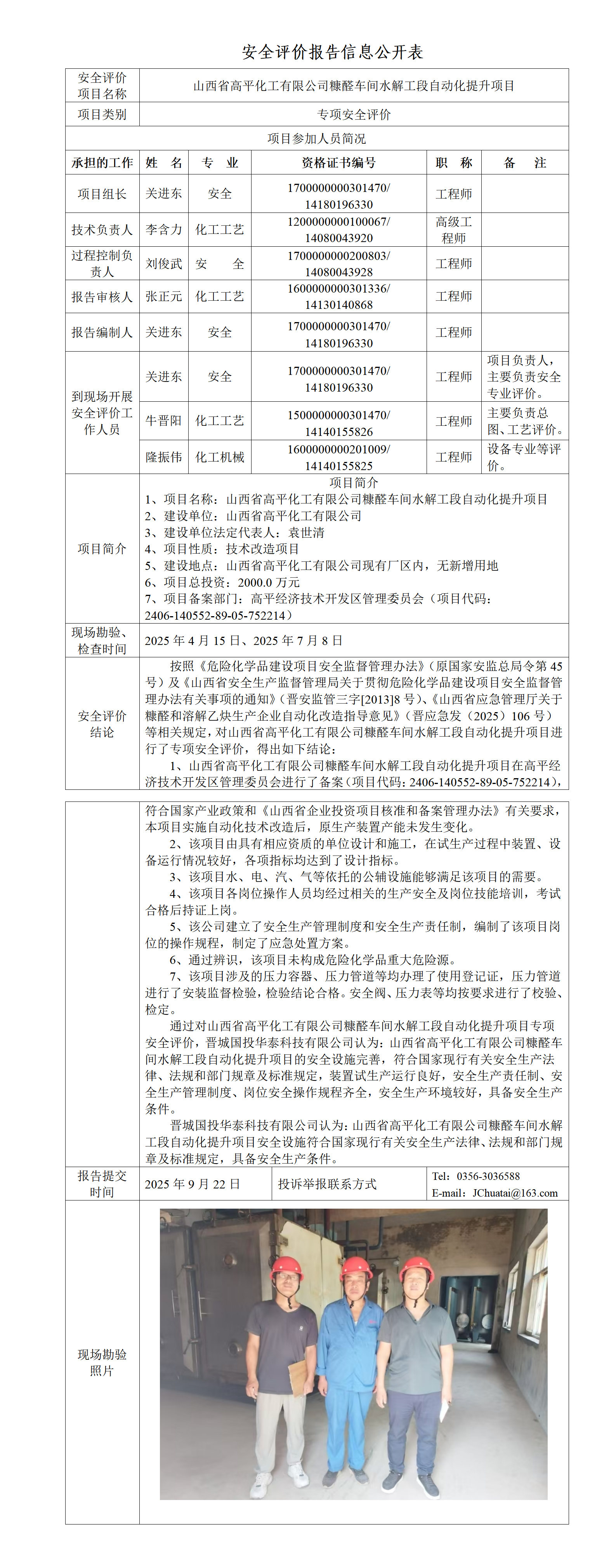 山西省高平化工有限公司糠醛車間水解工段自動化提升項目專項安全評價